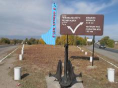 Остановился навязчивый таксист и стал предлагать мне свои услуги (мол, довезу до Пристани за 20 сомов). Пришлось дважды объяснять ему, что принципиально иду пешком. Вот основная трасса повернула налево, а прямо пошла дорога к музейно-мемориальному комплексу Н.М.Пржевальского. За вход на его территорию заплатил 30 сомов и пошёл смотреть музей.