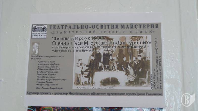 Показ сцен із спектаклю за твором Михайла Булгакова «Біла гвардія» у виконанні акторів театру естради «Фейєрія» (художній керівник Інна Присікайло) відбудеться сьогоді в Чернігівському обласному художньому музеї ім.Григорія Галагана.