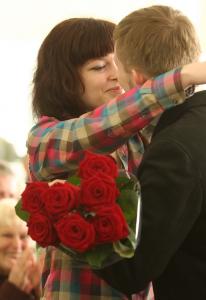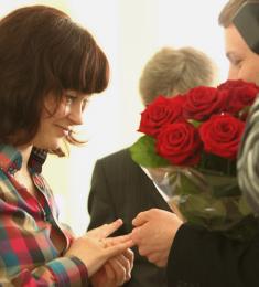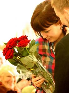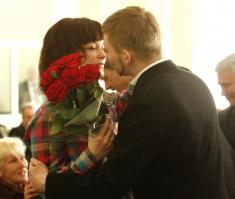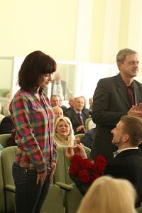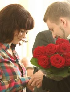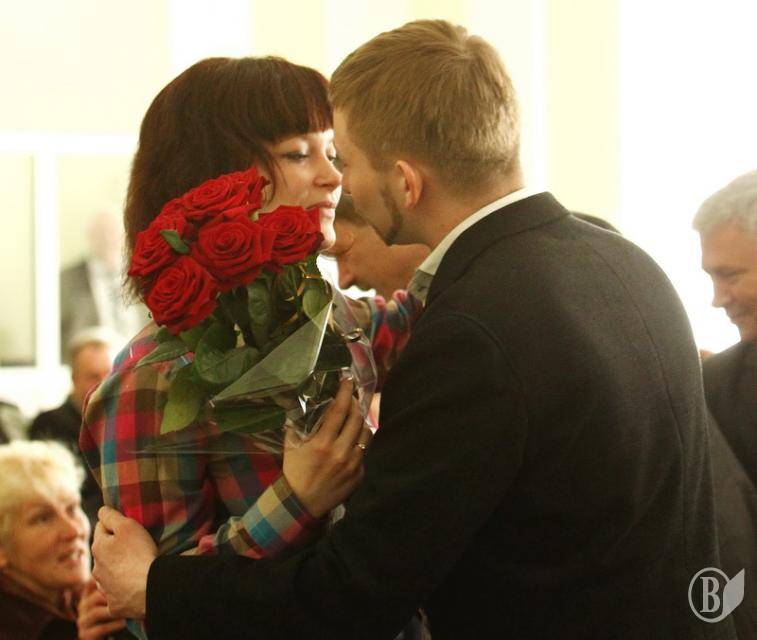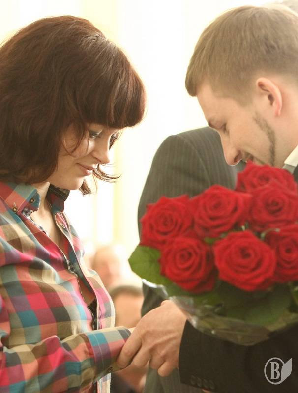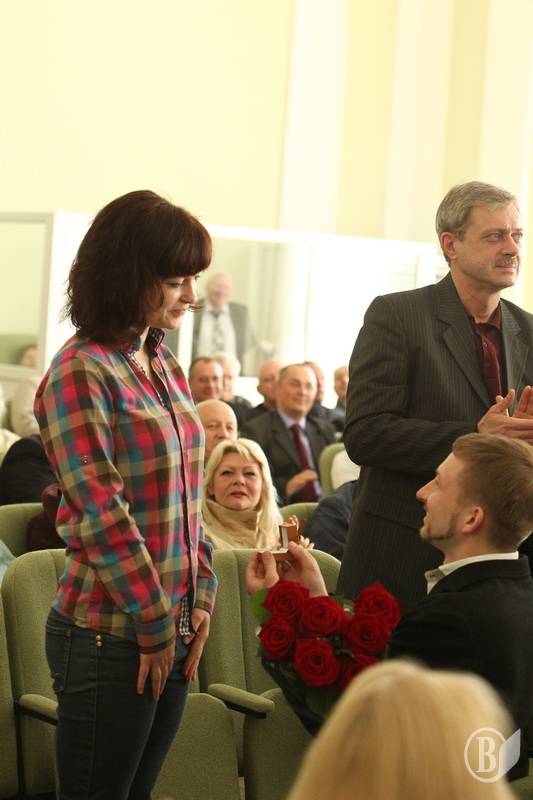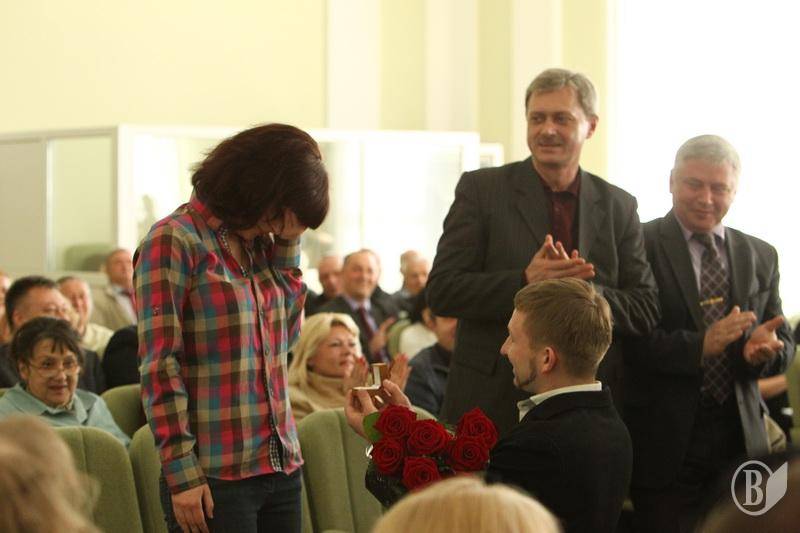 Вийшовши до президії з букетом троянд, він запропонував вийти заміж присутній у залі Олі Різенко.