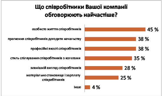 Як свідчать результати опитування, проведеного Міжнародним кадровим порталом HeadHunter Україна, найпопулярніші теми для пліток — особисте життя співробітників і особливості їх спілкування з керівництвом.