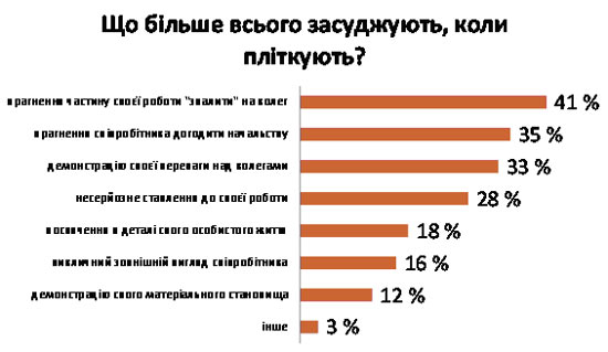 За даними опитування, першість серед засуджуваних моделей поведінки отримало прагнення співробітника «звалити» частину своєї роботи на колег. 41% опитаних не схвалюють таку модель поведінки. На другому місці серед учинків, котрі засуджують, — прагнення догодити начальству (35%).