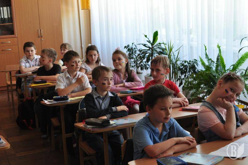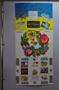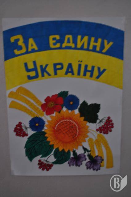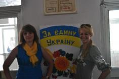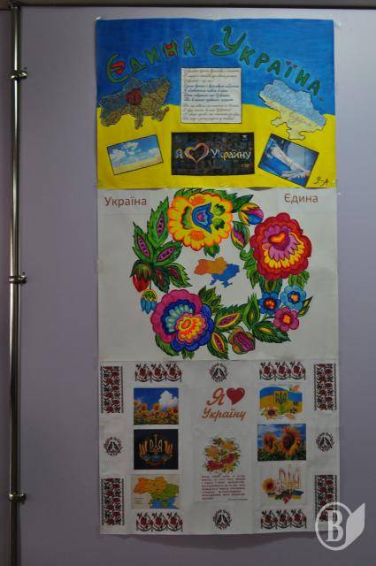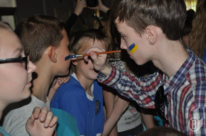 У фойє волонтери розмальовували учням щічки та руки в національні кольори, намалювали стенд-газети патріотичної тематики.