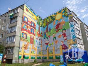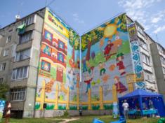 Представители МБФ Добрых дел организовали яркий детский праздник, презентовав широкой общественности громадное разноцветное графити. Детский рисунок победительницы конкурса перенесли на стены многоэтажек.
