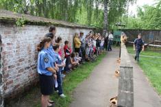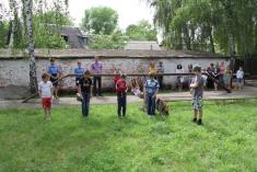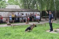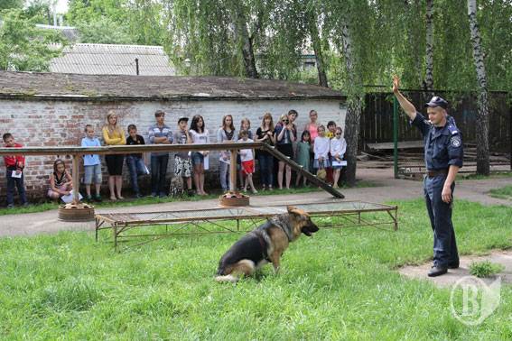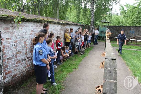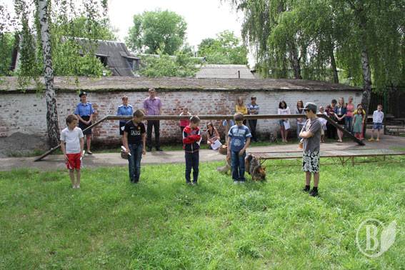 Інспектор-кінолог кінологічного центру при УМВС в Чернігівській області Дмитро Страдомський після короткої оглядової екскурсії уздовж вольєрів з чотирилапими вихованцями запросив дітлахів на тренувальний стадіон для демонстрування навичок і вмінь, якими володіє йог пес «Бакс» (йому лише півтора року).