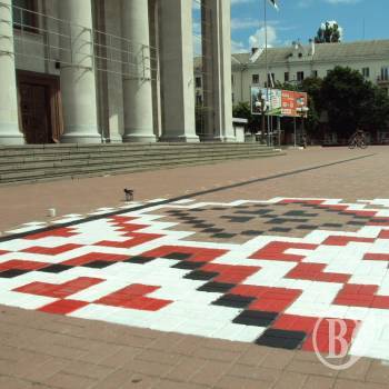 Громадські активісти поблизу головної сцени області почали розмальовувати плитку у народні кольори – червоний, чорний та білий.