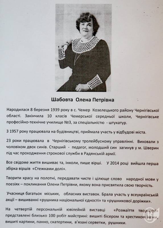 На Чернігівщині нині творять свою красу 962 майстрині з вишивки. Підтвердженням тому є відкриття виставки творів народного майстра Шабовти Олени за спеціальністю – штукатур. Вона з 1947 року відбудовувала наше славне місто.