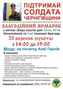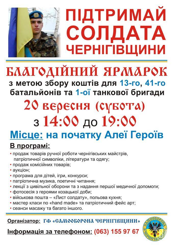 БЛАГОДІЙНИЙ ЯРМАРОК «ПІДТРИМАЙ СОЛДАТА ЧЕРНІГІВЩИНИ» відбудеться 20 вересня (субота) з 14,00 до 19,00 на початку Алеї Героїв з метою збору коштів для 13, 14 батальйонів та 1-ї танкової бригади.