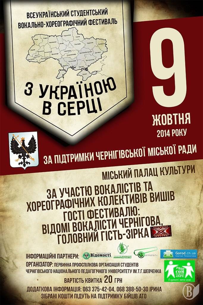 Всеукраїнський студентський вокально-хореографічний фестиваль "З Україною в серці" відбудеться 9 жовтня о 18:00 у Міському палаці культури.