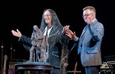 Але цього разу організатори підготували для Кена і для глядачів справжній сюрприз. На сцену драматичного театру ім.Тараса Шевченка вийшли водночас три маестро- рок-музикант Кен Хенслі, скульптор Геннадій Єршов та диригент симфонічного оркестру Микола Сукач.