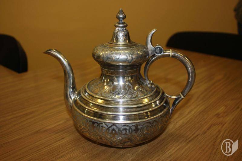 Старший науковий співробітник відділу фондів Наталія Малюк, оглянувши отриманий коштовний посуд, сказала, що виготовили його у відомій фірмі «Сазиков» у 1852 році зі срібла 875 проби. Фірма відома тим, що з 1846 року була придворним постачальником. Отже, ймовірно, що цим посудом користувалися при царському дворі.