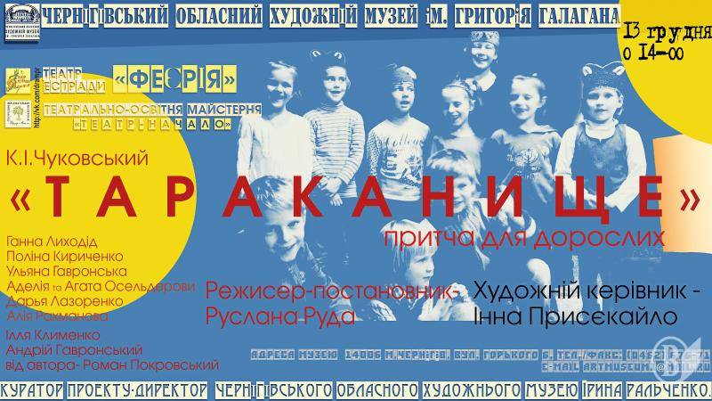 Вистава "Тараканище" у виконанні акторів театру естради "Фейєрія" (художній керівник Інна Присєкайло, автор ідеї - Роман Покровський, режисер постановник - Руслана Руда) відбудеться 13 грудня о 14-00 в Чернігівському обласному художньому музеї ім. Григорія Галаганав рамках проекта "Драматичний простір музею".