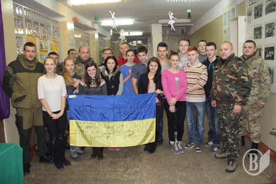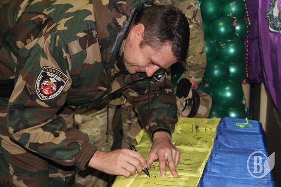 Бійці теж прийшли не з порожніми руками - після патріотичної фольклорної програми, під час якої школярі розповідали міліціонерам патріотичні вірші та висловлювали щирі побажання, захисники Вітчизни передали директору школи прапор України, на якому кожний боєць написав своє вітання та побажання майбутньому поколінню.