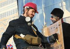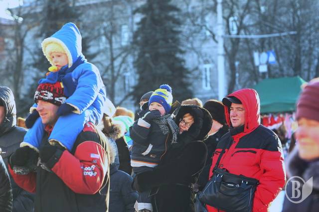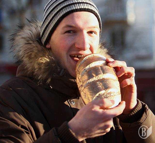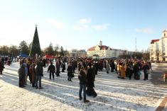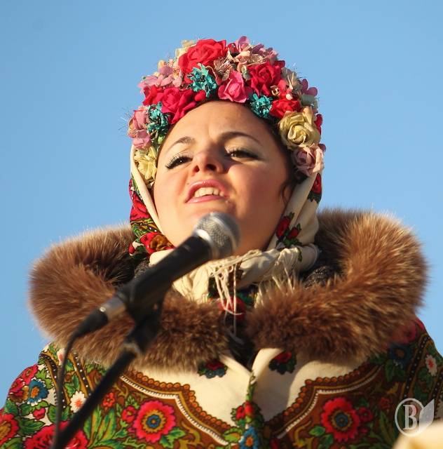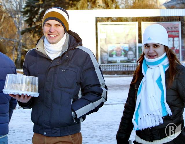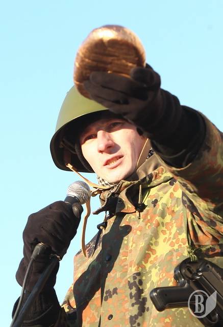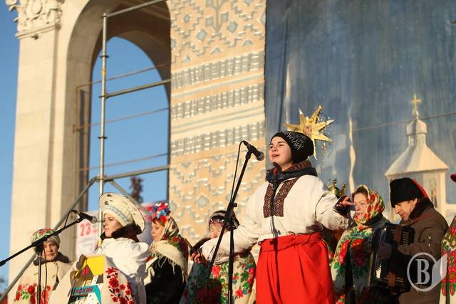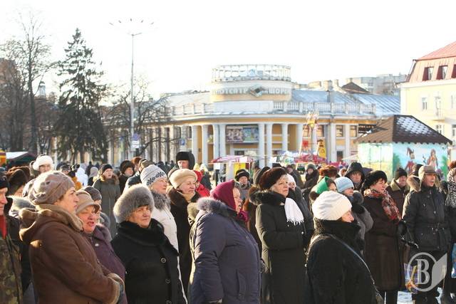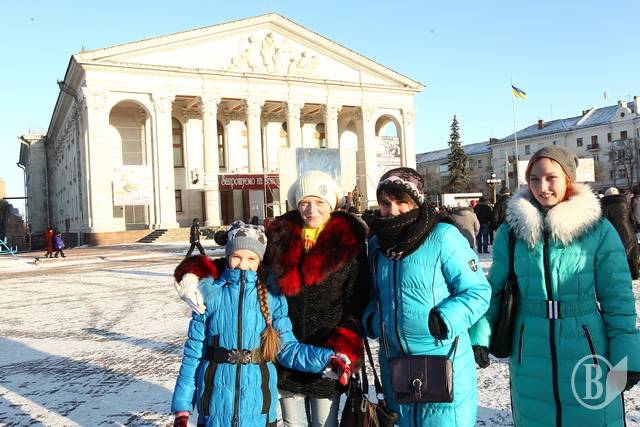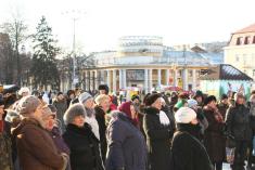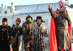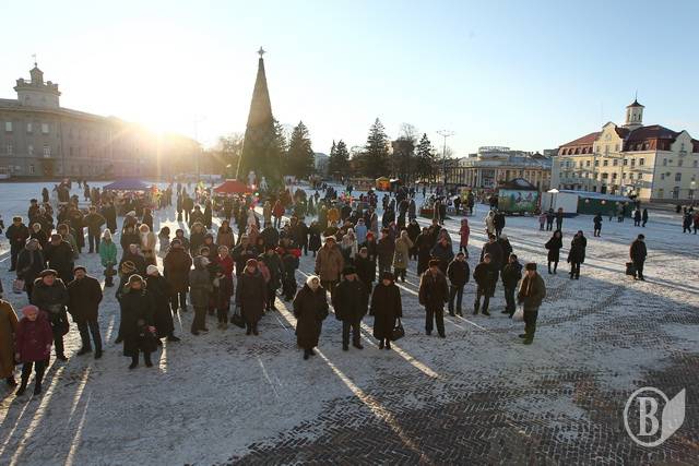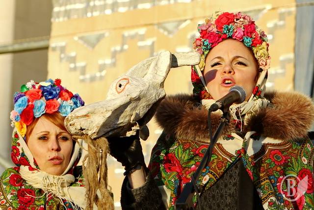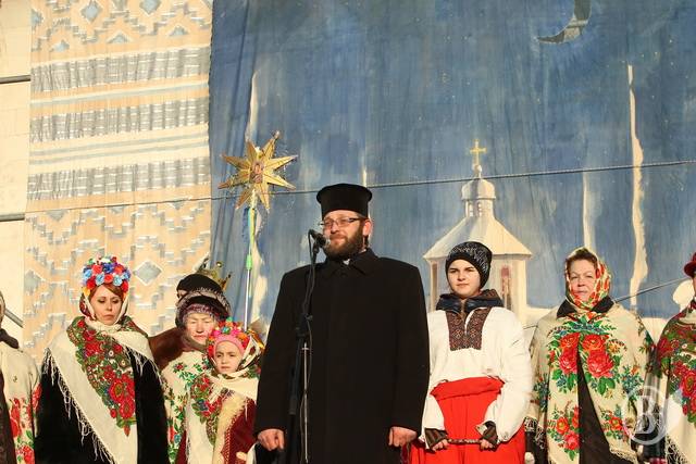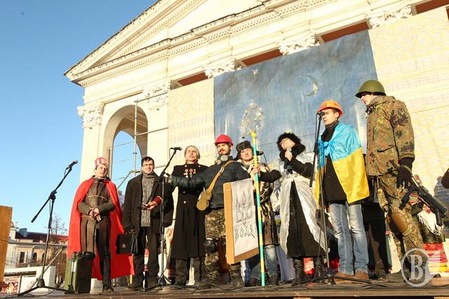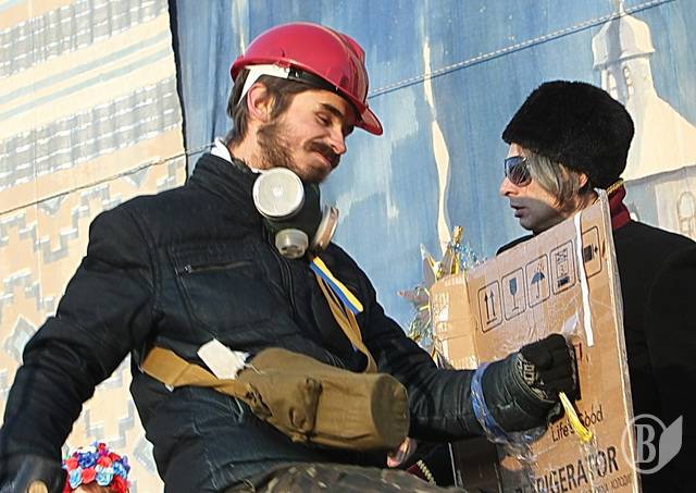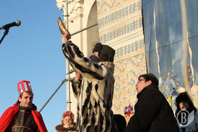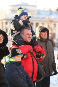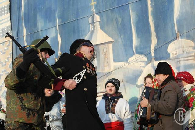 Завершился рождественский вертеп сценой, где украинский доброволец и активист Майдана победили Ирода-Пуйло, легитимного Януковича, немногословного Царева и Азирова. “Золотой” батон Януковича, который достался военному и майдановцу после их победы над Иродом и его прихвостнями, продали с аукциона за 70 гривен. Все средства, собранные во время выступления активистов, будут переданы Единому волонтерскому центру в поддержку украинской армии.