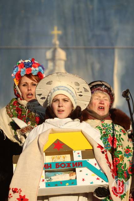 Вертеп по событиям 2014-го года сыграли активисты Единого волонтерского центра 7-го января в Чернигове, на Красной площади и продали на аукционе “золотой” батон за 70 гривен.