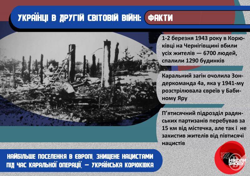 Наприклад, мало хто знає, що село Корюківка на Чернігівщині – найбільше в Європі поселення, знищене нацистами під час каральної операції. 1-2 березня 1943 року в Корюківці нацисти вбили 6700 людей та спалили 1290 будинків.