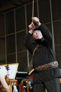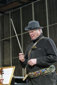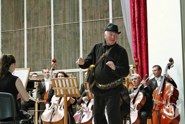 Музыканты удивлены. И тут на сцену выходит сам дирижер, глубокоуважаемый Николай Сукач, в форме охотника. Да, именно в форме охотника. Он так вошел в роль, что под звуки польки стал «мочить коней». То кукушка куковала, потом утки крякали. И в этом его поддерживал зрительный зал.
