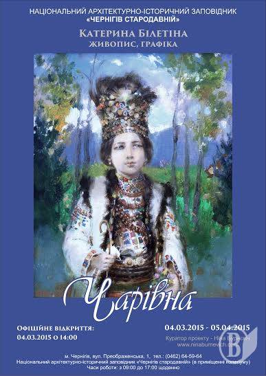 Відкриття виставки української художниці-портретистки Катерини Білетіної «Чарівна» відбудеться 4 березня о 14.00 у Національному архітектурно-історичному заповіднику «Чернігів стародавній» (у Колегіумі, на Валу).