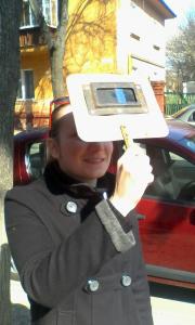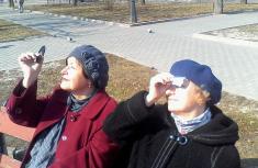 «Це рідке явище, нечасто буває, тому ми з колегою прийшли подивитися – продовжує Людмила. – Сьогодні спостерігаємо за сонцем через плівкову вставку з дискети. Ще непогано видно через два шари звичайної фольги від цукерки».