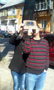 Пік сонячного затемнення у Чернігові припав приблизно на полудень. В цей час декілька людей вийшли подивитись на затемнення під стінами дитячої бібліотеки. Вони тримали якийсь чудернацький на перший погляд пристрій.