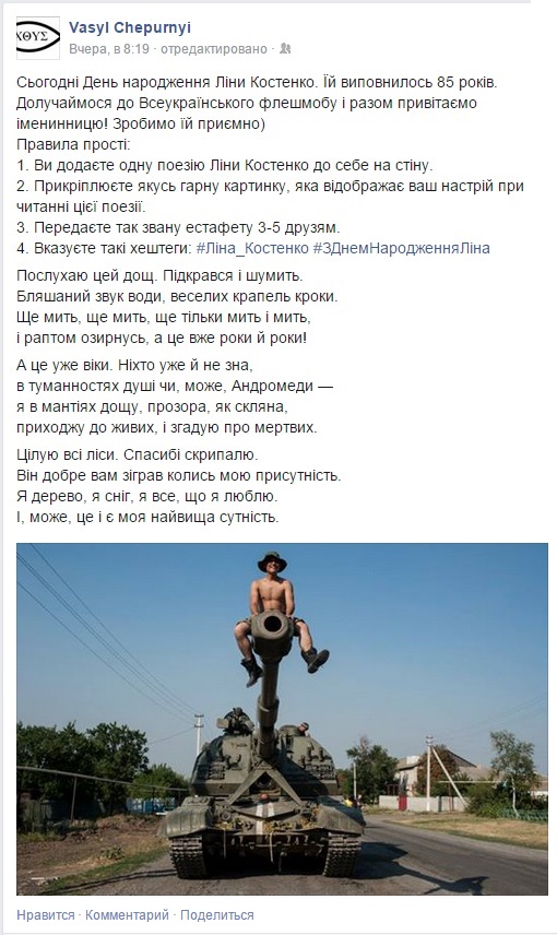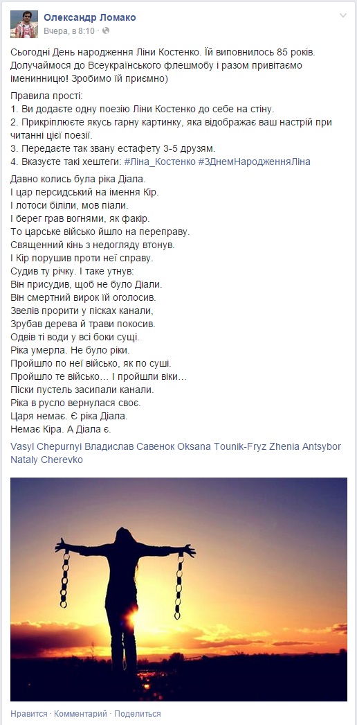 Користувачі соцмереж додавали поезію Ліни Костенко з картинкою до себе на стіну і передавали так звану естафету своїм друзям. Крім того, чернігівці змінювали світлини обкладинок своїх сторінок на ілюстрації з уривками віршів поетеси.