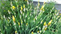 Вона дуже любить квіти. Біля її двору висаджено з десяток сортів півників.