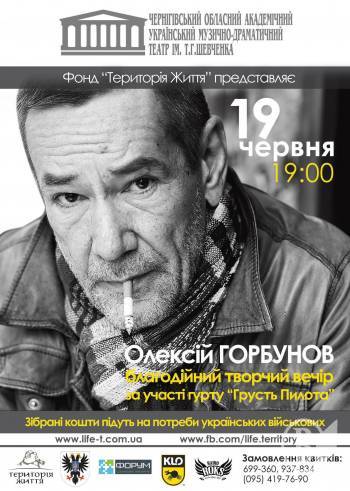 19 июня в Черниговском музыкально-драматическом театре имени Т. Г. Шевченко состоится благотворительный творческий вечер Алексея Горбунова и группы «Грусть Пилота». В программе знаменитые песни Окуджавы, Высоцкого, Цоя и других известных исполнителей.