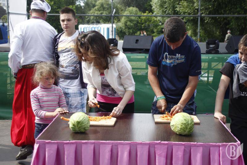 О впечатляющих объемах говорили два здоровенных казана с буряком, тазики с капустой, яблоками, морковью и помидорами. Юрась Красюк, основатель Фестиваля Борща, говорит, что фест появился на свет лет семь назад. Получился такой этно-гастрономический микс – участники ездят по всей Украине и изучают кулинарную карту страны.