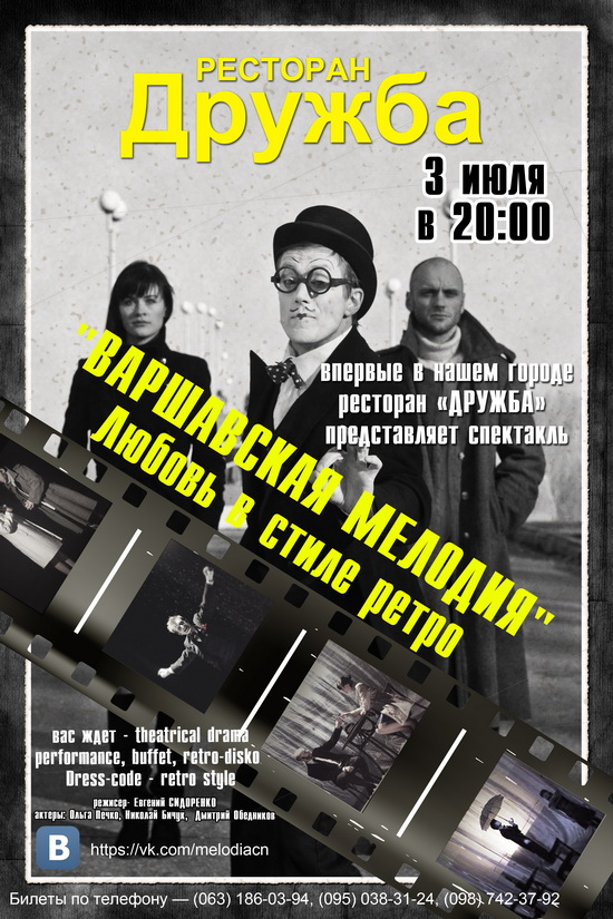 В то время как все театры закрыты на летние каникулы... черниговский Молодежный приглашает ВАС на удивительный спектакль о настоящей любви "ВАРШАВСКАЯ МЕЛОДИЯ" в ресторан ДРУЖБА (СВЕТОФОР).