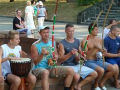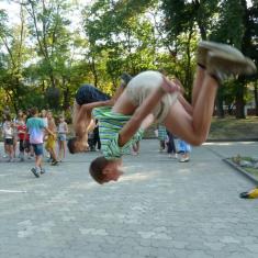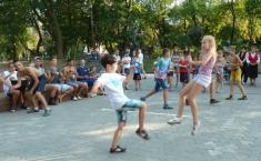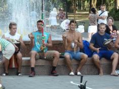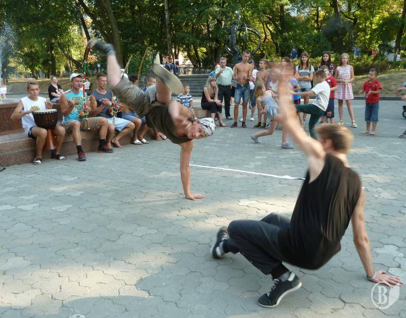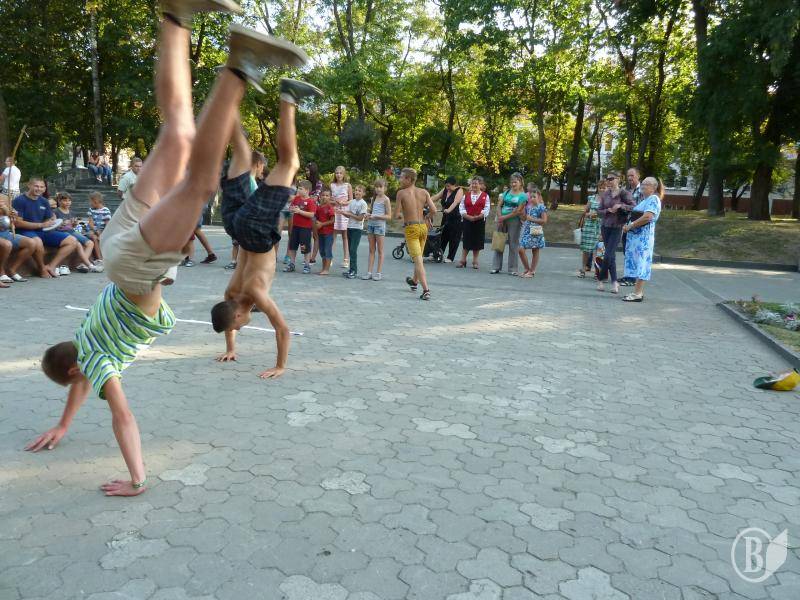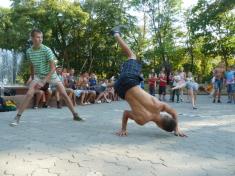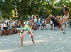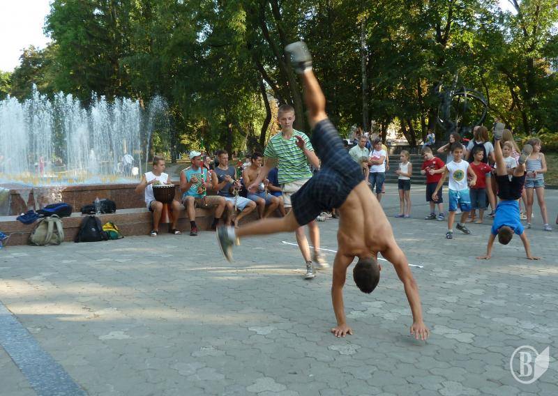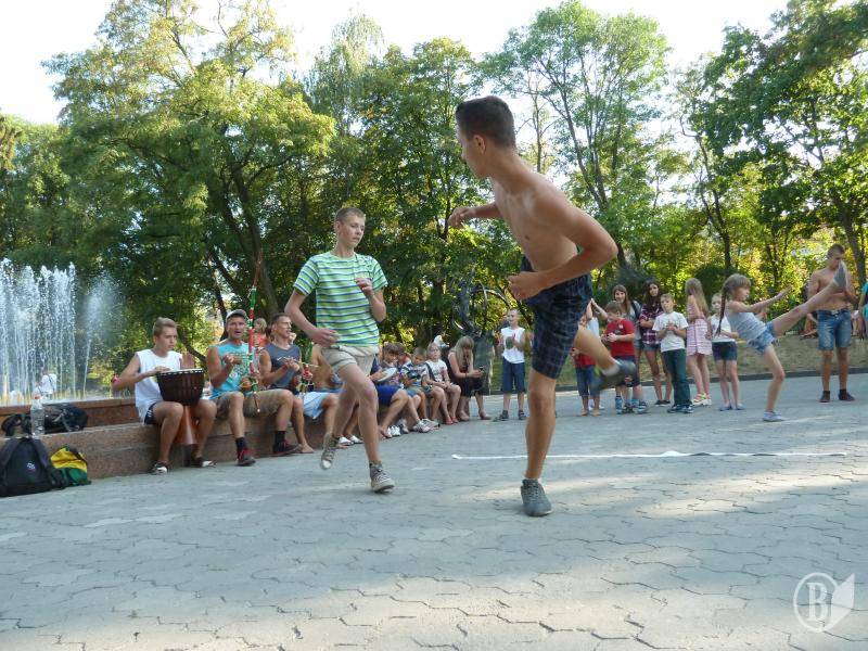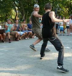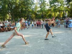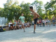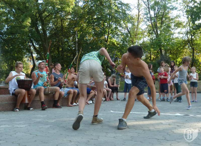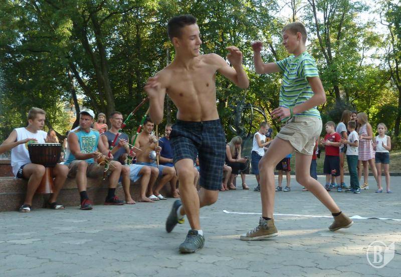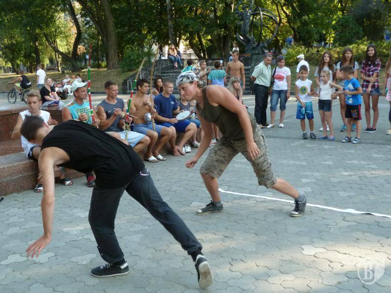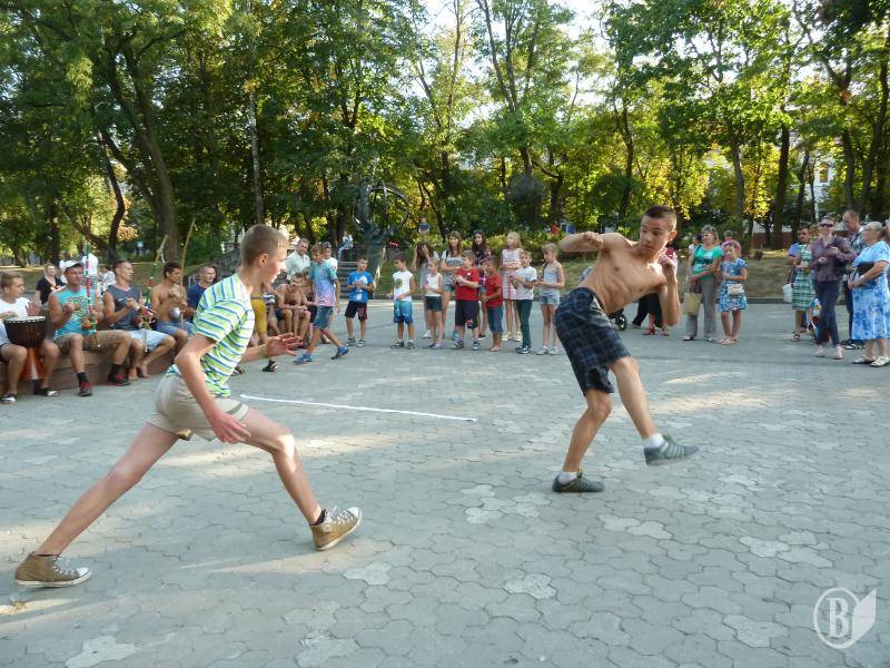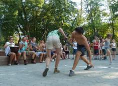 Афробразильське бойове мистецтво з елементами танцю, музики і акробатики демонстрували сьогодні, на День Прапора вільні митці на чернігівській Алеї героїв.