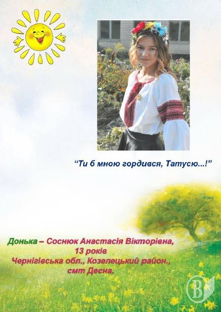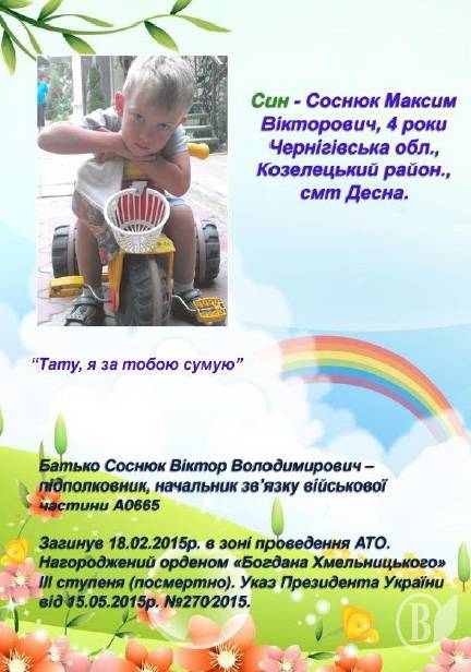 «Жінки та маленькі діти смт. Десна, що у Чернігівській області, пережили страшний і трагічний вересень 2014-го року. Дехто так і не дочекався своїх батьків-військовослужбовців із зони АТО, а двоє малюків народилися вже після загибелі тата. Таким дітям та їхнім матерям якнайперше необхідна допомога!», - розповіла куратор проекту Надія Гордієнко.