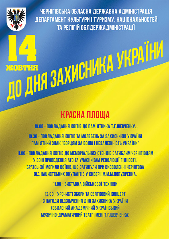 12.00-13.30 Урочисті збори та святковий концерт з нагоди відзначення Дня Захисника України (Чернігівський обласний академічний український музично-драматичний театр ім. Т.Г. Шевченка);