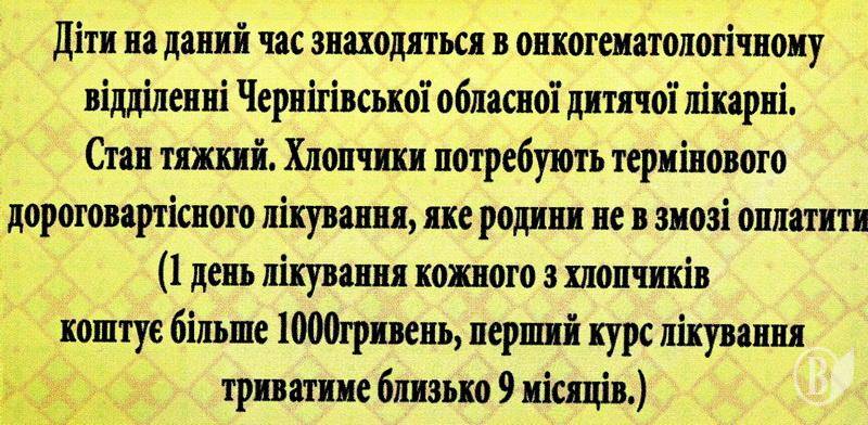 Кожна гривна для них – хвилина життя. Один день лікування кожного з хлопчиків коштує більше 1000 грн. На офіційному сайті буде звітність про зібрані кошти. Всі гроші будуть направлені на придбання ліків для Артемів. Ми маємо велику віру в те, що хлопчики одужають та будуть мати щасливе дитинство.