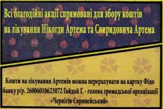 Одним із пунктів цієї програми є збір коштів для лікування дітей які мають онкологічні захворювання. Це вже друга акція по збору коштів для двох Артемів.