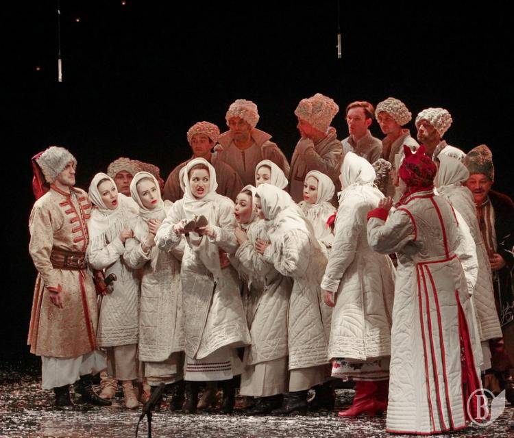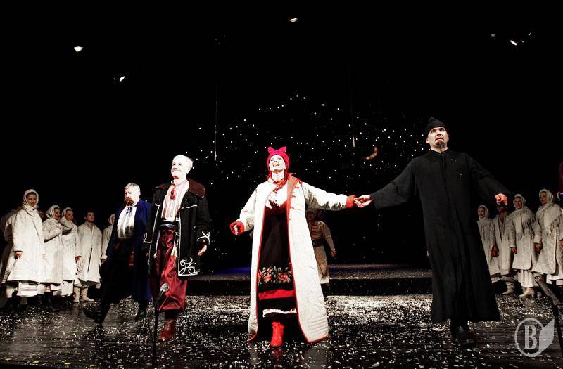 Колоритным украшением динамического сценического действа стали песни и шутливые выходки группы колядщиков, которые воспроизводят и традиционные украинские обряды, и фольклорные мотивы и образы бессмертного гоголевского произведения. Будучи переплавленными через неугомонную фантазию творцов этого фееричного действа, народные мотивы стали не повторением заскорузлых штампов мнимой «народности», а эффективным средством, подчиненным творческому замыслу постановщика этого спектакля.