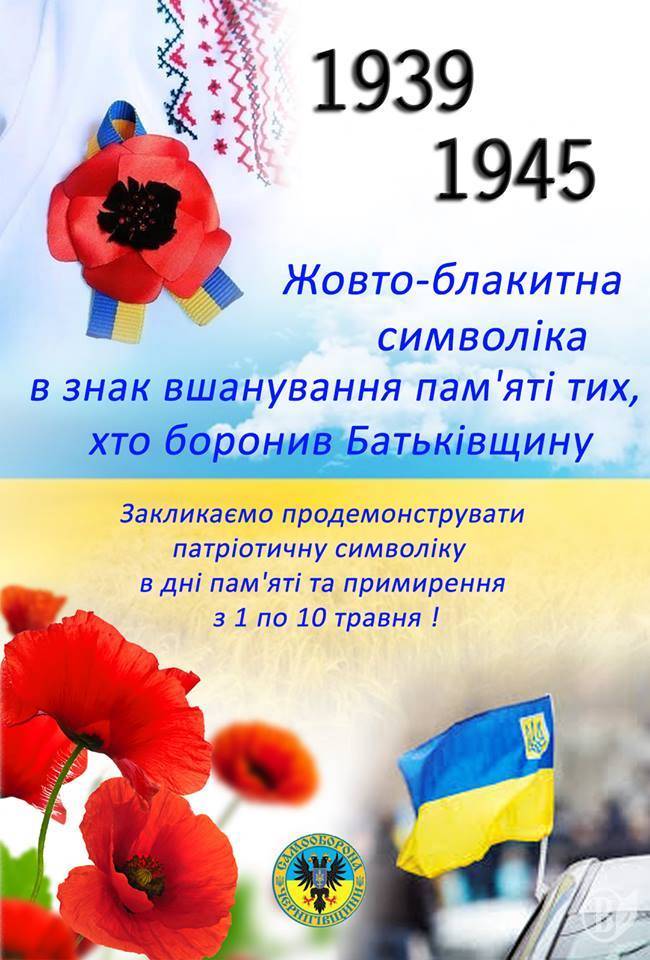 Общественное формирование призывает так выразить свой почет тем украинцам, кто защищал Родину и сделал неоценимый взнос в победу над нацистской Германией и тем, кто сегодня отстаивает нашу независимость в этой непровозглашенной войне на Востоке.