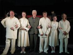 Кличуть до зали. Перед початком вистави, до глядачів звертається Віталій Гольцов. Він та педагог-організатор театру Яна Паніна мають представити виставу глядачам, серед яких - члени журі Чернігівської обласної премії імені Михайла Коцюбинського, колеги, друзі театру.