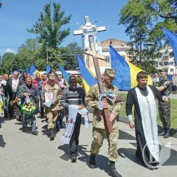 Жители города около храма св. вмц Екатерины попрощалась с погибшим участником антитеррористической операции. Это рядовой Игорь Медведь.