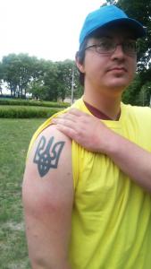 Но о своем корне парень не забывает и месяц в лагере хочет провести с пользой: и деток английскому научить и самому научиться разговаривать на украинском. На правом плече у Девида – папе с Гербом Украины.