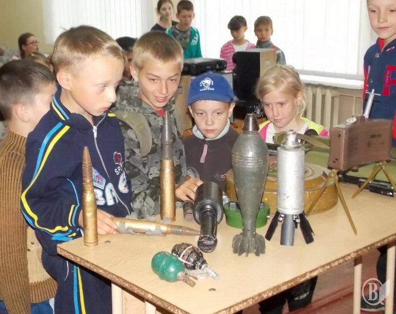 Сначала дети просматривали учебный фильм "Взрывоопасные находки", а затем ознакомились с экспонатами пиротехнического класса - патронами, минами, гранатами, снарядами, гранатометами и тому подобное.