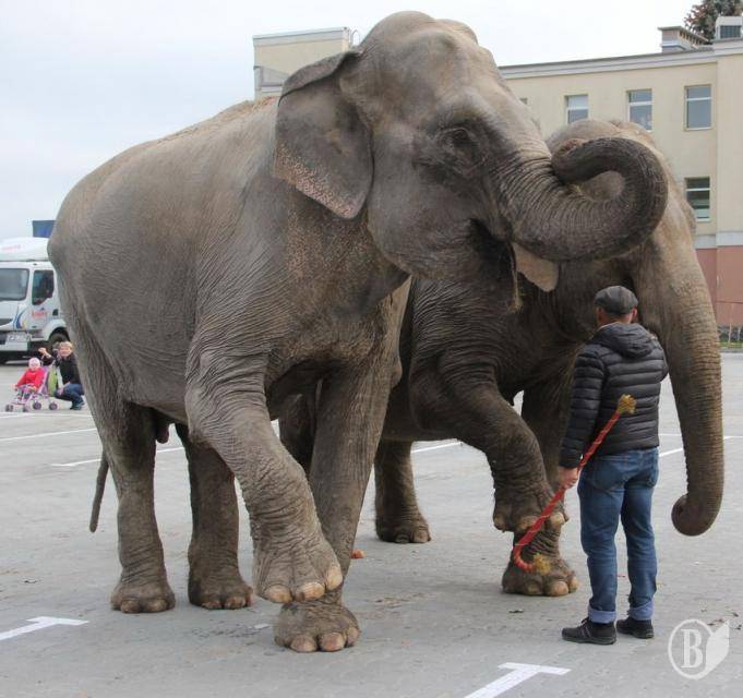 На території парковки біля ТРЦ «Голівуд» прогулюються слони. Двоє. Звісно, з наглядачами.