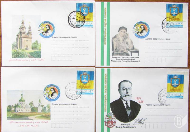 Ко дню проведения Всеукраинского литературно-художественного праздника «Седневская осень-2016» изготовлено пять почтовых конвертов с изображением Гриця Золотюсенького, Федора Лизогуба и известных достопримечательностей — Георгиевской и Воскресенской церквей и камяницы Лизогубов, а также открытки, на которых изображен бюст Федора Лизогуба, установленный в Седневе в 2012 году, фотография Георгиевской церкви, сделанная в 20-х годах ХХ века, современный вид храма и рисунок Т. Г. Шевченко, на котором изображена седневская камяница. Также в рамках проекта Укрпочты «Собственная марка» изготовлена эксклюзивная марка с гербом поселкового совета. В день проведения праздника в местном почтовом отделении состоялось погашение марок на отмеченных конвертах и открытках.