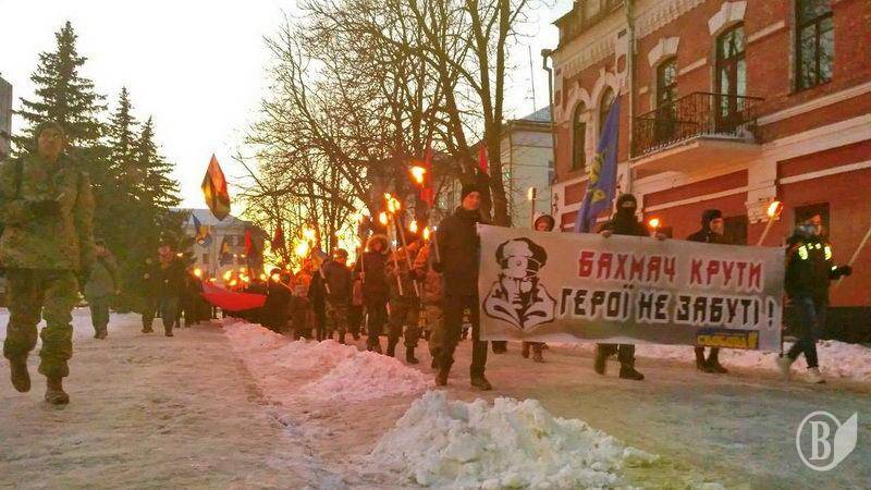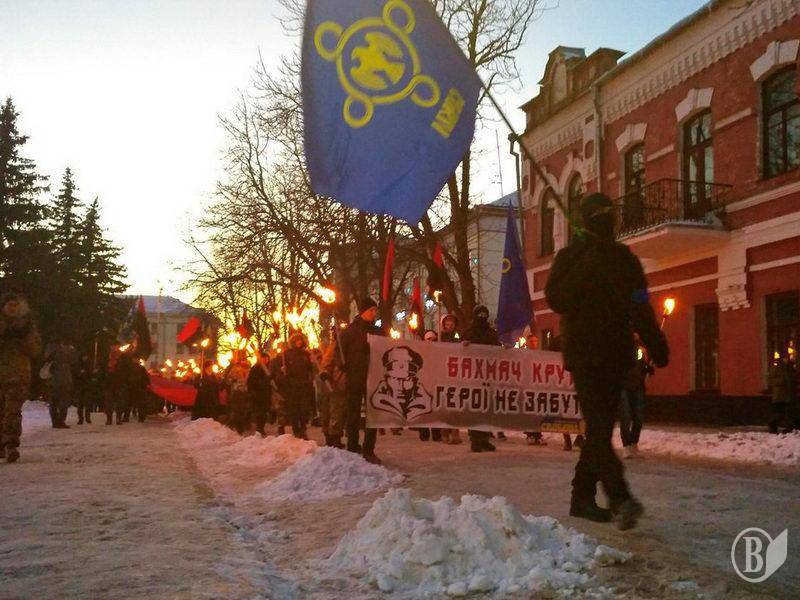 О 17.00 за ініціативи ВГО «Сокіл» та ВО «Свобода» з площі Івана Франка у Ніжині рушила хода центральними вулицями міста до Хреста встановленого на честь оборонців Крут. Діти й дорослі зі смолоскипами в руках та державним і червоно-чорним стягом боротьби крокували пліч-о-пліч, виголошуючи гасла «Бахмач Крути – Герої не забуті», «Наша земля – наші Герої» та ін. Ніжин сколихнувся під впевненими кроками націоналістів.