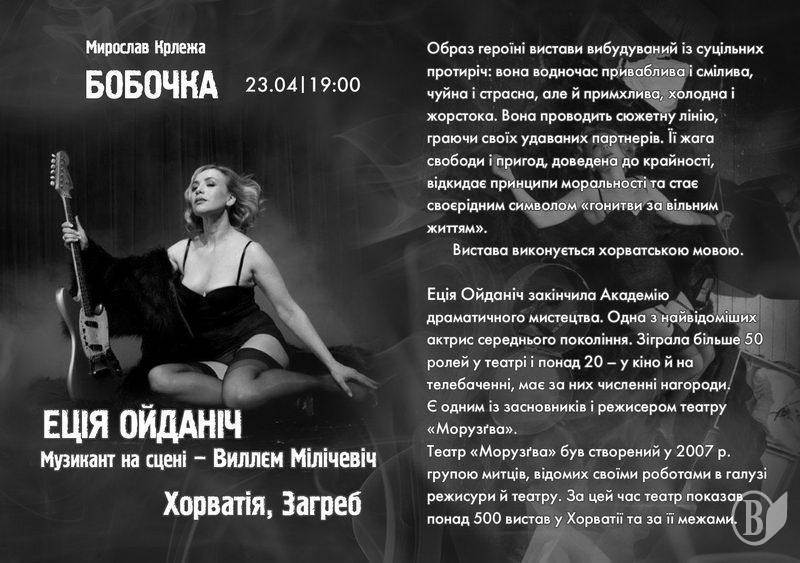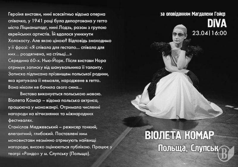 Другий день фестивальної програми передбачає зустріч з польською актрисою Віолетою Комар, яка представить моновиставу «Diva» за оповіданням Магдалени Гойєр, де розкаже хвилюючу історію про випробування, що випали на долю видатної оперної співачки, яка в юності пережила жахи голокосту. Також в цей день виступить актриса з хорватського міста Загреб Еція Ойданіч з виставою Мирослава Крлежа «Бобочка», в якій жага її героїні до цілковитої свободи та нехтування моральними принципами стає символом гонитви за «вільним життям».
