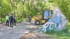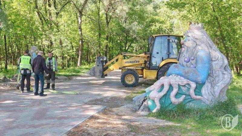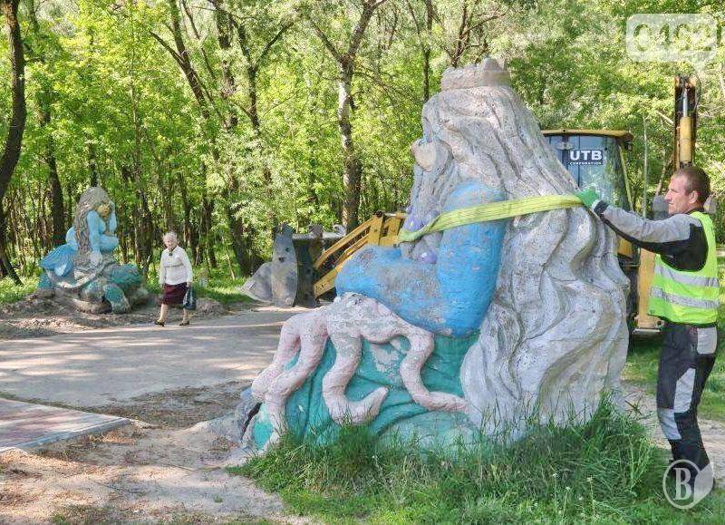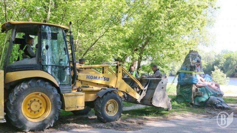 На вході до міського пляжу «Золотой берег» з боку пішохідної доріжки від Центрального парку культури й відпочинку триває демонтаж скульптур Нептуна і русалки.