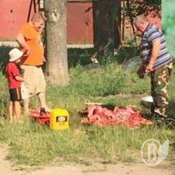 Визирнувши у вікно, біля дитячого майданчика вони побачили тіло свині, яку щойно закололи.