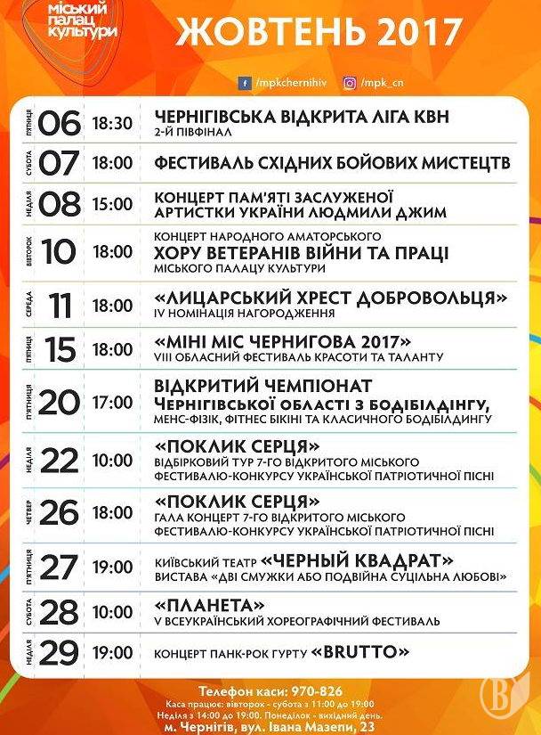 Комунальне підприємство «Чернігівський міський палац культури» повідомляє про заходи, заплановані на жовтень 2017 року.