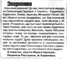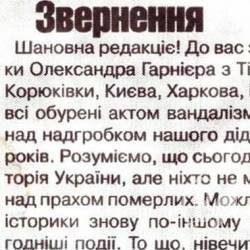 Нащадки чекіста Гарнієра прагнуть влаштувати перепоховання предка з Корюківки до рідного села Сядрине.