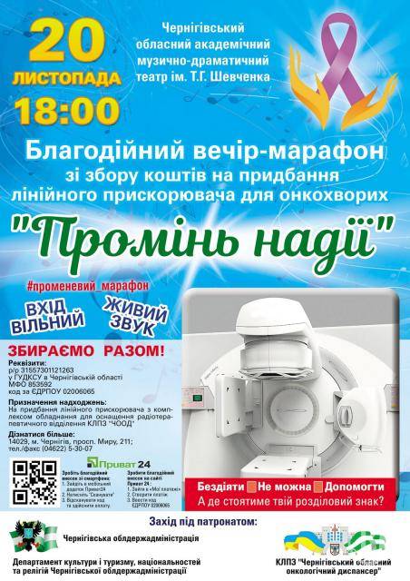 В Чернігівському обласному академічному музично-драматичному театрі 20 листопада відбудеться благодійний вечір-марафон «Промінь надії» зі збору коштів на лінійний прискорювач для онкохворих.