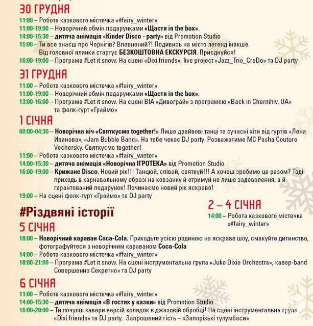 Щодня для Вас працюватиме: головна ялинка міста, ковзанка, цікава дитяча анімація, містечко майстрів, казкові фото-зони.