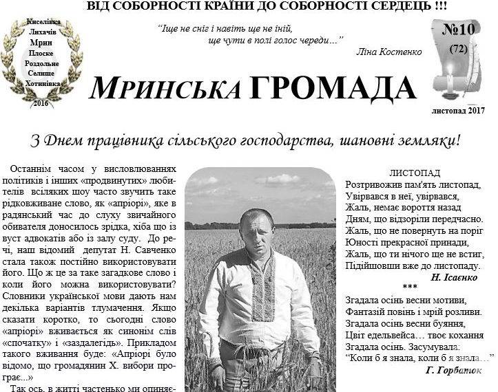 Новини, цікаві історичні факти, творчі роботи учасників літературного клубу, привітання, подяки, інформацію про сучасні проекти та ініціативи, досягнення та успіхи – про все це жителі Мринської громади дізнаються із щомісячного вісника. Назва якого збігається із назвою громади – «Мринська ГРОМАДА». Цей інформаційний неполітичний бюлетень видається бібліотекарями за підтримки селищної ради накладом 500 штук і поширюється безкоштовно.